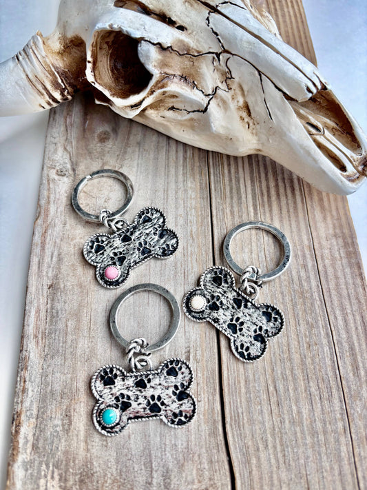 Paw Printed Dog Bone Metal Pendant Keychain : Turquoise