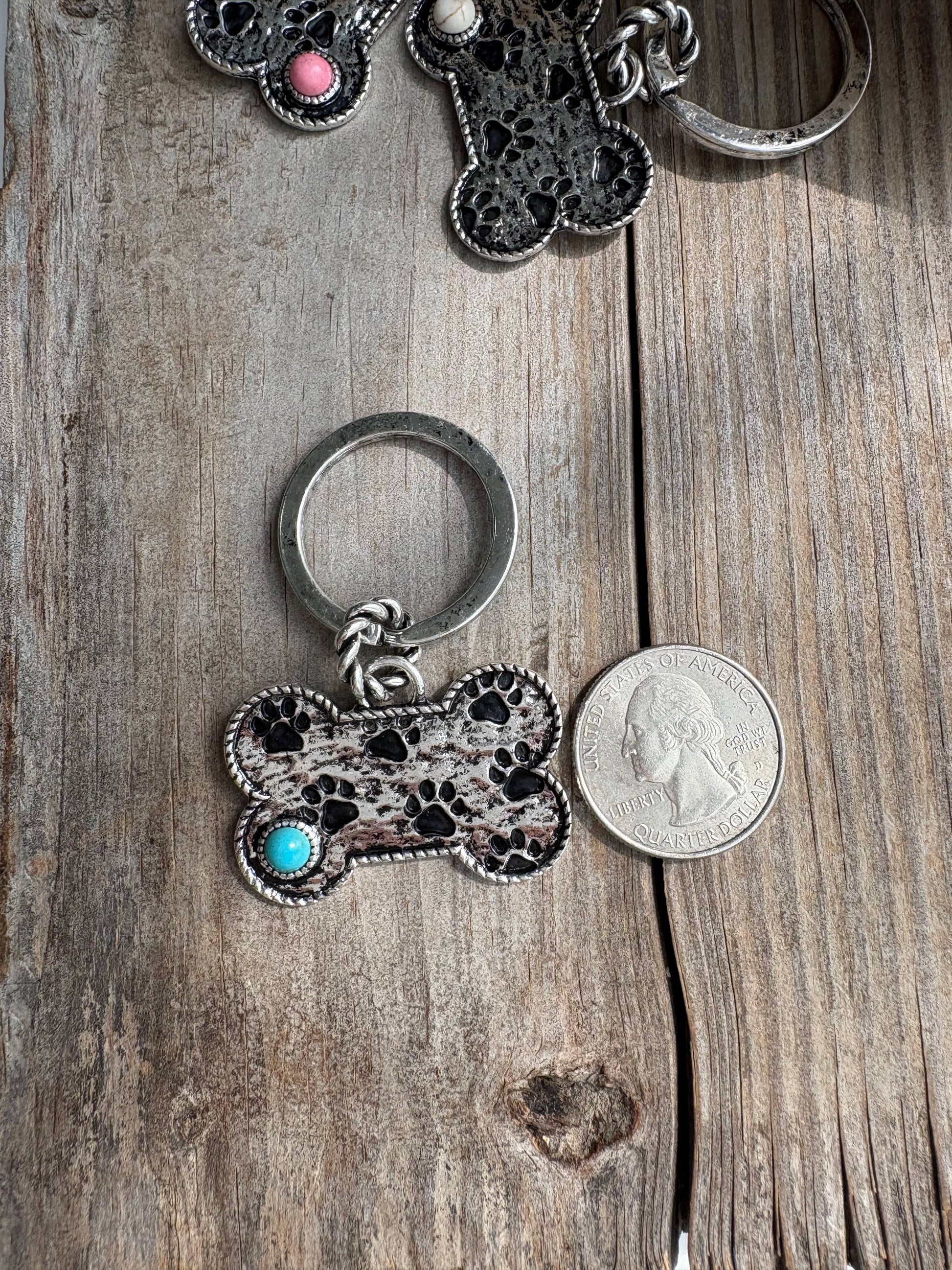 Paw Printed Dog Bone Metal Pendant Keychain : Pink